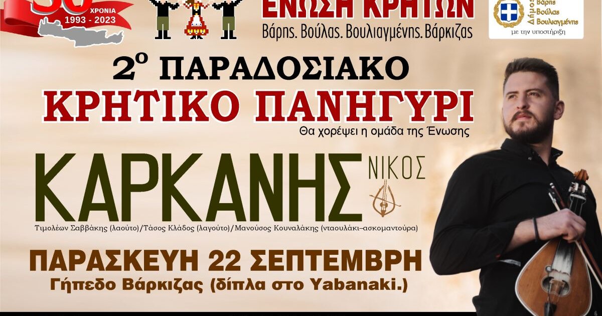 Το Δ.Σ. της Ένωσης Κρητών Βάρης, Βούλας, Βουλιαγμένης, Βάρκιζας προσκαλεί να τιμήσετε με την παρουσια σας στο προγραμματισμένο 2ο Παραδοσιακό Κρητικό Πανηγύρι στο γήπεδο, στην παραλία της Βάρκιζας (δίπλα στο Yabanaki) την Παρασκευή 22 Σεπτέμβρη (προσέλευση στις 20:00).