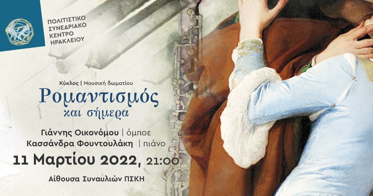 Η εκδήλωση έχει τον τίτλο «Ρομαντισμός και σήμερα», με τον Γιάννη Οικονόμου, όμποε, και την Κασσάνδρα Φουντουλάκη, πιάνο, σε έργα Σούμαν, Λιστ, Πουλένκ, Μποζά και Ι. Γκίκα.