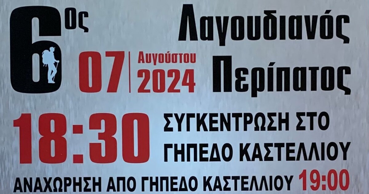 Στο πλαίσιο των Πολιτιστικών Εκδηλώσεων που διοργανώνει ο Πολιτιστικός Σύλλογος Λαγού Πεδιάδος για το 2024, συνδιοργανώνει με τη στήριξη της Περιφέρειας Κρήτης τον 6ο Λαγουδιανό Περίπατο.