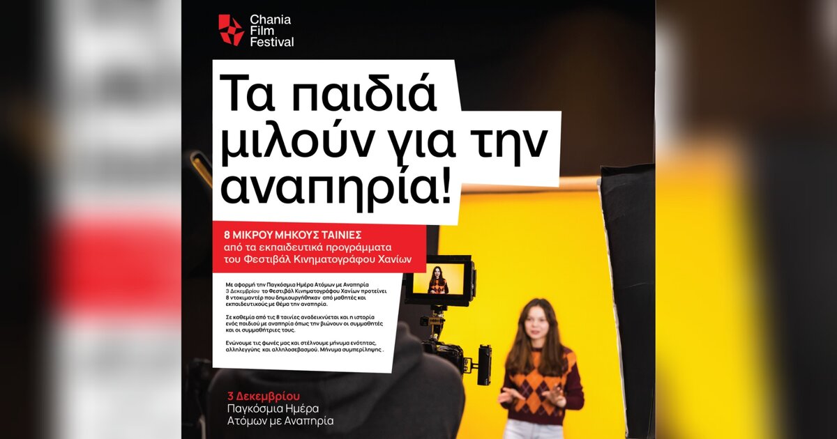 Με αφορμή την Παγκόσμια Ημέρα Ατόμων με Αναπηρία [ 3 Δεκεμβρίου ] το Φεστιβάλ Κινηματογράφου Χανίων προτείνει 8 ντοκιμαντέρ που δημιουργήθηκαν από μαθητές και εκπαιδευτικούς με θέμα την αναπηρία.