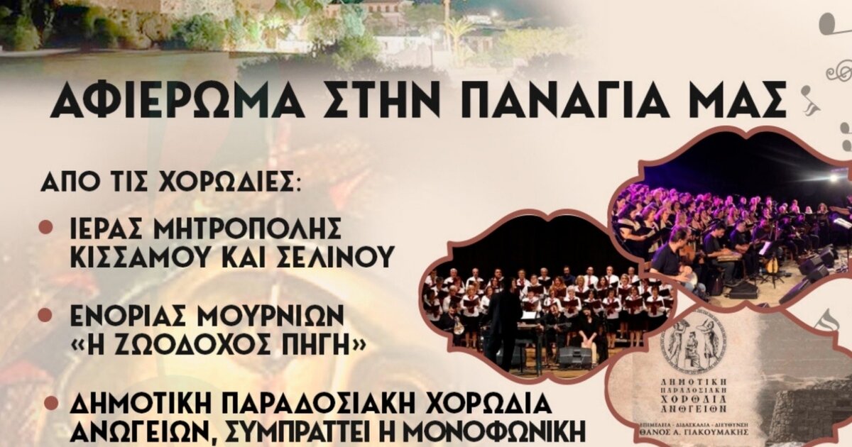 Εκδήλωση – μουσικό αντάμωμα, με τίτλο: «Αφιέρωμα στην Παναγία μας» από τις Χορωδίες της Ιεράς Μητροπόλεως Κισάμου και Σελίνου, της Ενορίας Μουρνιών «Η Ζωοδόχος Πηγή» και της Δημοτικής Παραδοσιακής Χορωδίας Ανωγείων μετά της Χορωδίας Αγίου Δημητρίου Λιμένος Ηρακλείου, σε συνδιοργάνωση της Ιεράς Μητροπόλεως Κισάμου και Σελίνου και του Δήμου Κισάμου θα γίνει την Πέμπτη 17 Αυγούστου στις 9 το βράδυ στην Ιερά Μονή Κοιμήσεως της Θεοτόκου Χρυσοσκαλιτίσσης.
