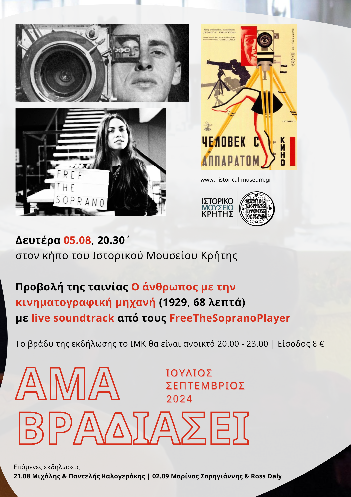 Ο Αύγουστος στο Άμα Βραδιάσει ξεκινάει με κινηματογράφο και μουσική. Τη Δευτέρα 5 Αυγούστου στις 20:30 θα προβληθεί η ταινία του Ντζίγκα Βερτόφ, «Ο άνθρωπος με την κινηματογραφική μηχανή». Την ταινία θα ντύσουν με μουσικό και φωνητικό αυτοσχεδιασμό οι FreeTheSopranoPlayer.
