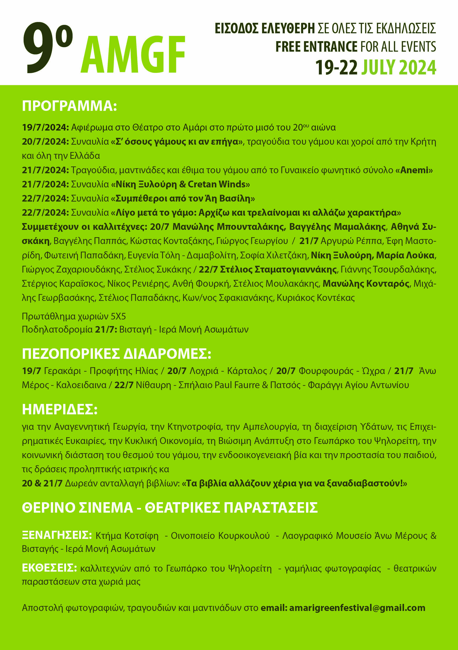 Το 9ο Amari Green Festival υπόσχεται τέσσερις ημέρες γεμάτες δράσεις, πολιτισμό και διασκέδαση. Σε συνεργασία με πάνω από δεκαπέντε Πολιτιστικούς Συλλόγους, καλλιτέχνες, μουσικούς, χορευτές, επιστήμονες και εθελοντές, το φεστιβάλ συμβάλλει στην προώθηση της τοπικής κουλτούρας και της αειφόρου ανάπτυξης. Σας περιμένουμε όλους να ζήσουμε μαζί αυτή τη μοναδική εμπειρία!