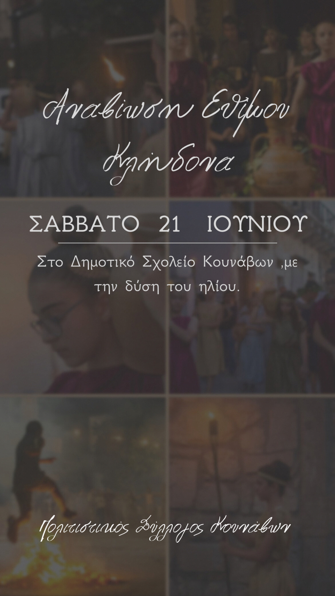 "Σάββατο 21 Ιουνίου επαναλαμβάνουμε και φέτος στους Κουνάβους το έθιμο του Κλήδονα. Ελάτε στο χωριό μας από νωρίς...