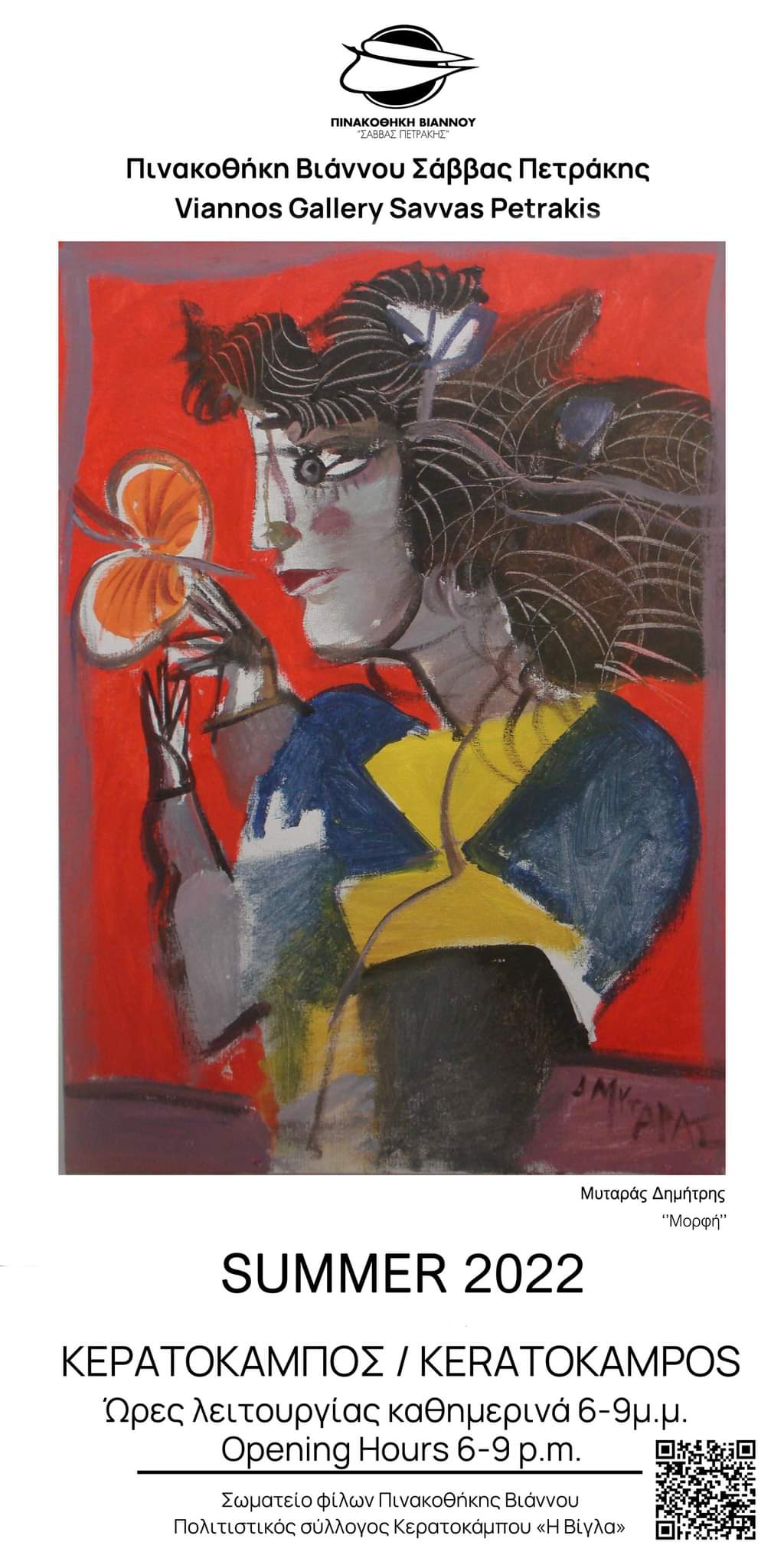 "Η Πινακοθήκη Βιάννου "Σάββας Πετράκης" στον Κερατόκαμπο ανακοινώνεται πως θα είναι ανοικτή για τους επισκέπτες της από την Παρασκευή 5 Αυγούστου και κάθε απόγευμα 6-9 μμ έως τα μέσα Σεπτεμβρίου.