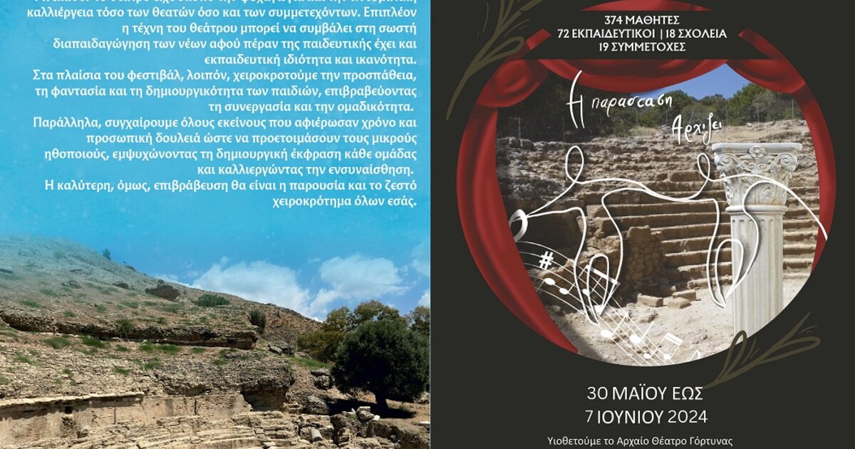 Ο Δήμος Γόρτυνας, το Υπουργείο Πολιτισμού – Εφορεία Αρχαιοτήτων Ηρακλείου η Περιφέρεια Κρήτης, το Περιφερειακό Ταμείο Ανάπτυξης Κρήτης και το Σωματείο «Διάζωμα» συνδιοργανώνουν το 10ο Μαθητικό Φεστιβάλ Θεάτρου και Μουσικής Δήμου Γόρτυνας, στον αρχαιολογικό χώρο της Γόρτυνας (Αρχαία Αγορά), από την Πέμπτη 30 Μαΐου έως την Παρασκευή 7 Ιουνίου 2024.