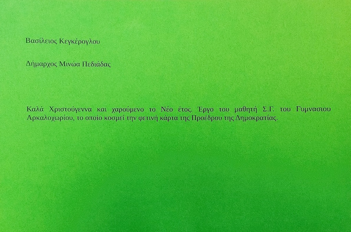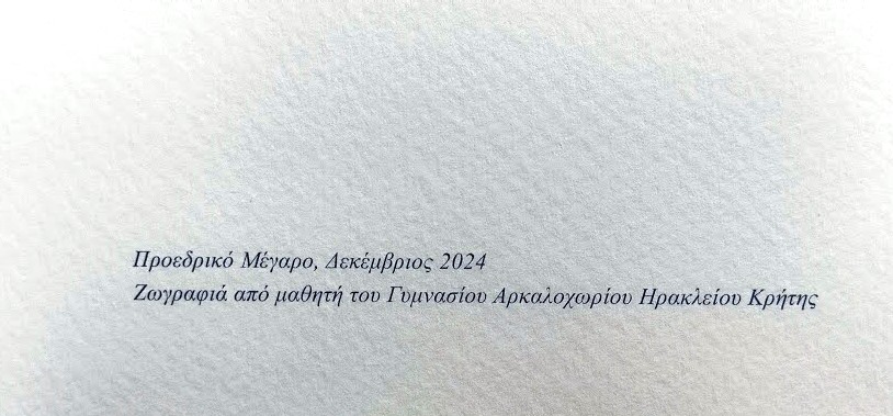 H ζωγραφιά του Γιώργου Σφακιανάκη του Δημητρίου, μαθητή της Γ' Τάξης του Γυμνασίου Αρκαλοχωρίου "κοσμεί" φέτος, την ευχετήρια κάρτα της Προέδρου της Δημοκρατίας Κατερίνας Σακελλαροπούλου.