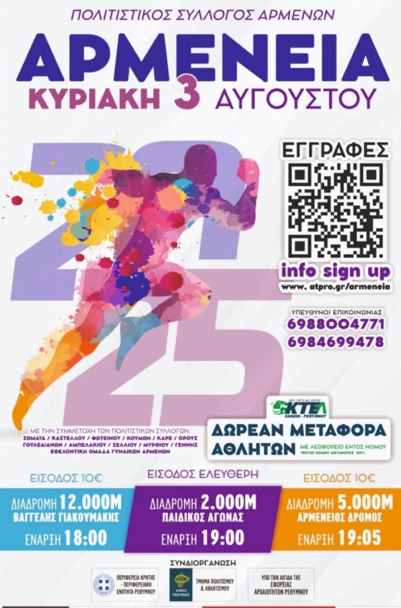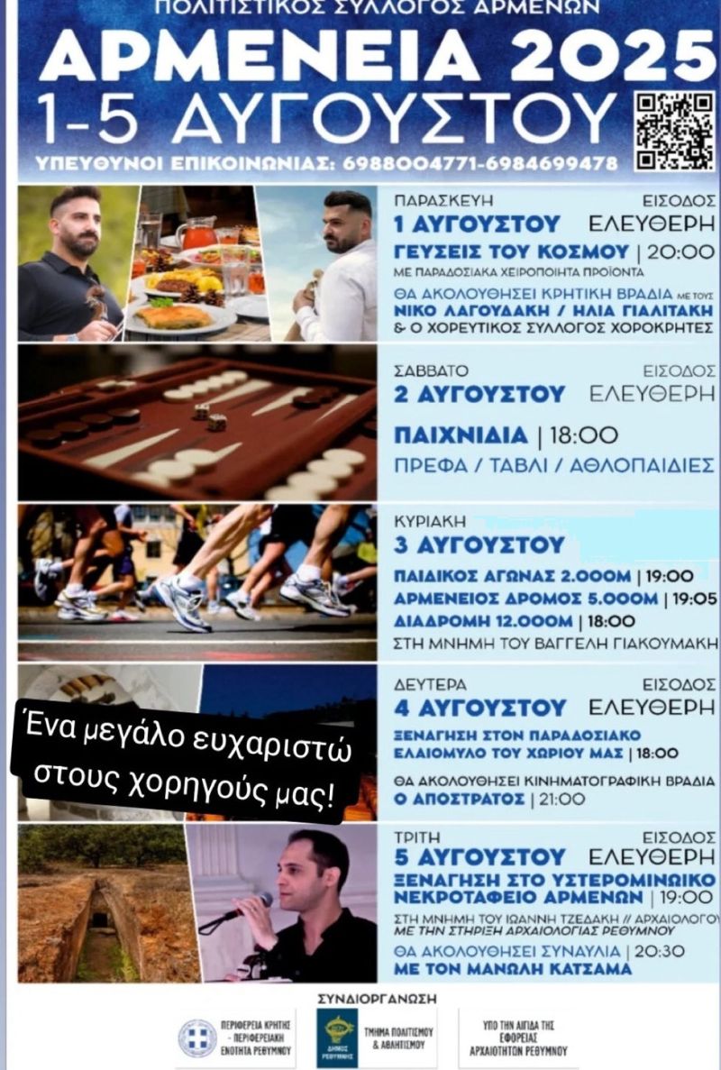 Με πλούσιο πρόγραμμα και τη συμμετοχή πολιτιστικών συλλόγων και φορέων της ευρύτερης περιοχής, επιστρέφουν φέτος δυναμικά οι Αθλητικές – Πολιτιστικές Εκδηλώσεις «ΑΡΜΕΝΕΙΑ 2025», οι οποίες θα πραγματοποιηθούν από την Παρασκευή 1 έως και την Τρίτη 5 Αυγούστου στον ιστορικό οικισμό των Αρμένων Ρεθύμνης.