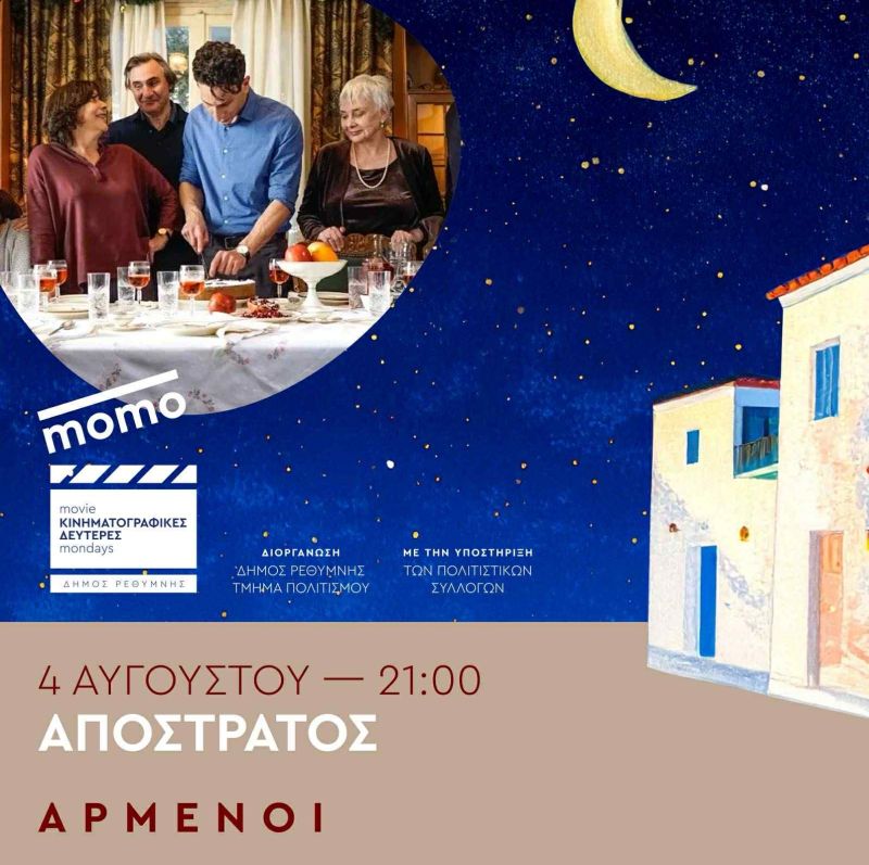 Τη Δευτέρα 4 Αυγούστου, το κοινό θα έχει την ευκαιρία να γνωρίσει τον παραδοσιακό ελαιόμυλο του χωριού, ενώ το βράδυ θα ακολουθήσει κινηματογραφική προβολή της ταινίας «Ο Αποστρατος», με ελεύθερη είσοδο, στο Γήπεδο Αρμένων.