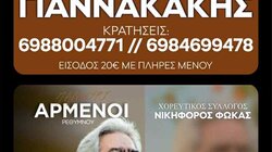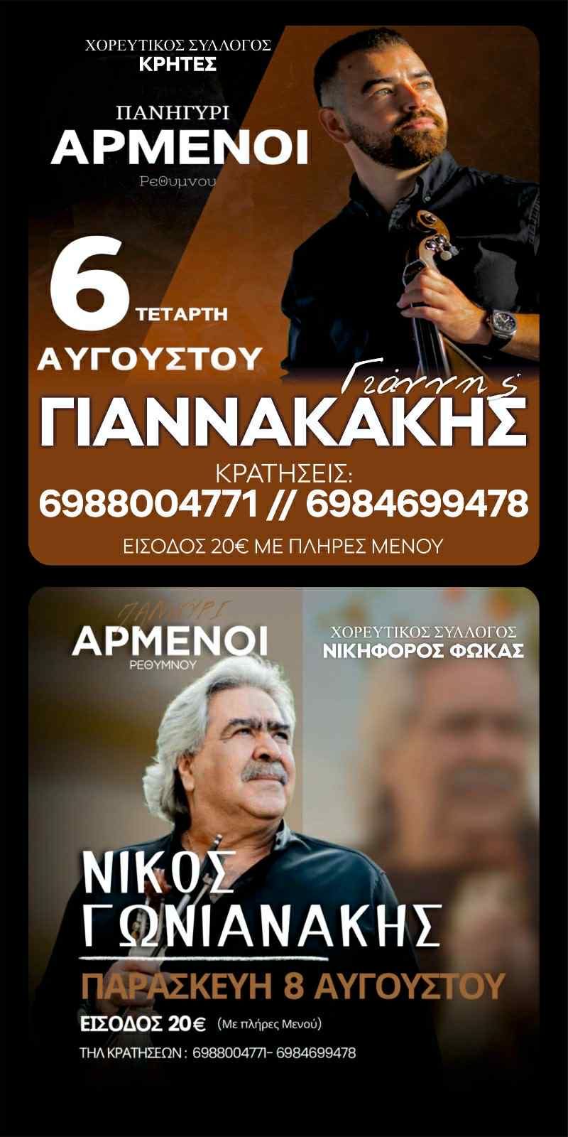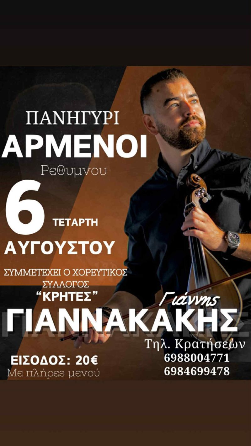 Στις 6 Αυγούστου ανήμερα του Σωτήρος Χριστού, ημέρα πανηγύρεως του Ι.Ν. Σωτήρος Χριστού Αρμένων, θα πραγματοποιηθεί το πανηγύρι - χοροεσπερίδα στον χώρο του Πολιτιστικού Συλλόγου με τον κρητικό καλλιτέχνη Γιάννη Γιαννακάκη και το συγκρότημά του.