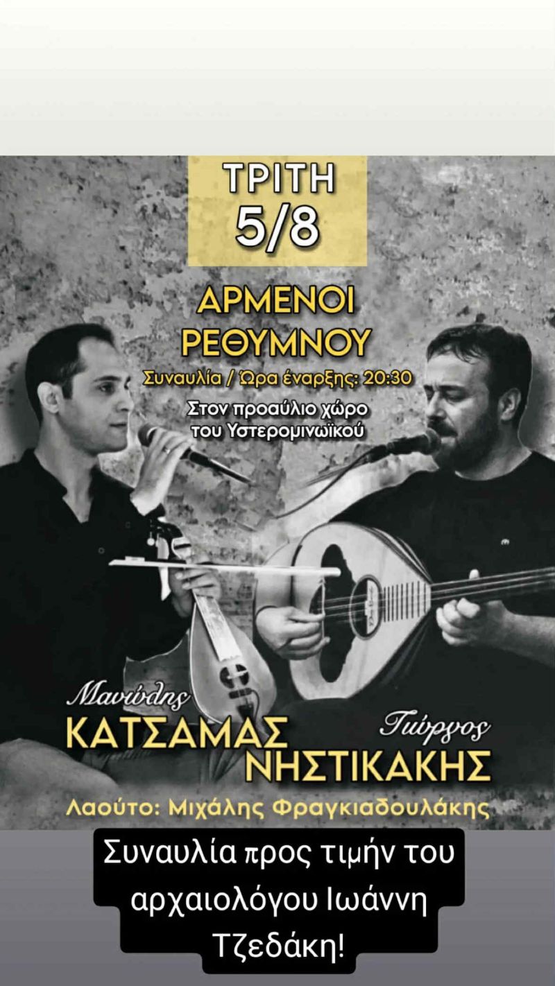 Οι εκδηλώσεις κορυφώνονται την Τρίτη 5 Αυγούστου, με ξενάγηση στο Υστερομινωικό Νεκροταφείο Αρμένων – έναν από τους σημαντικότερους αρχαιολογικούς χώρους της Κρήτης – και εκδήλωση αφιερωμένη στον σπουδαίο αρχαιολόγο Γιάννη Τζεδάκι, ο οποίος συνέβαλε καθοριστικά στην ανάδειξη του χώρου. Η εκδήλωση συνδιοργανώνεται με την Εφορεία Αρχαιοτήτων Ρεθύμνου. Η βραδιά θα κλείσει με συναυλία παραδοσιακής μουσικής με τον Μανώλη Κατσαμά.