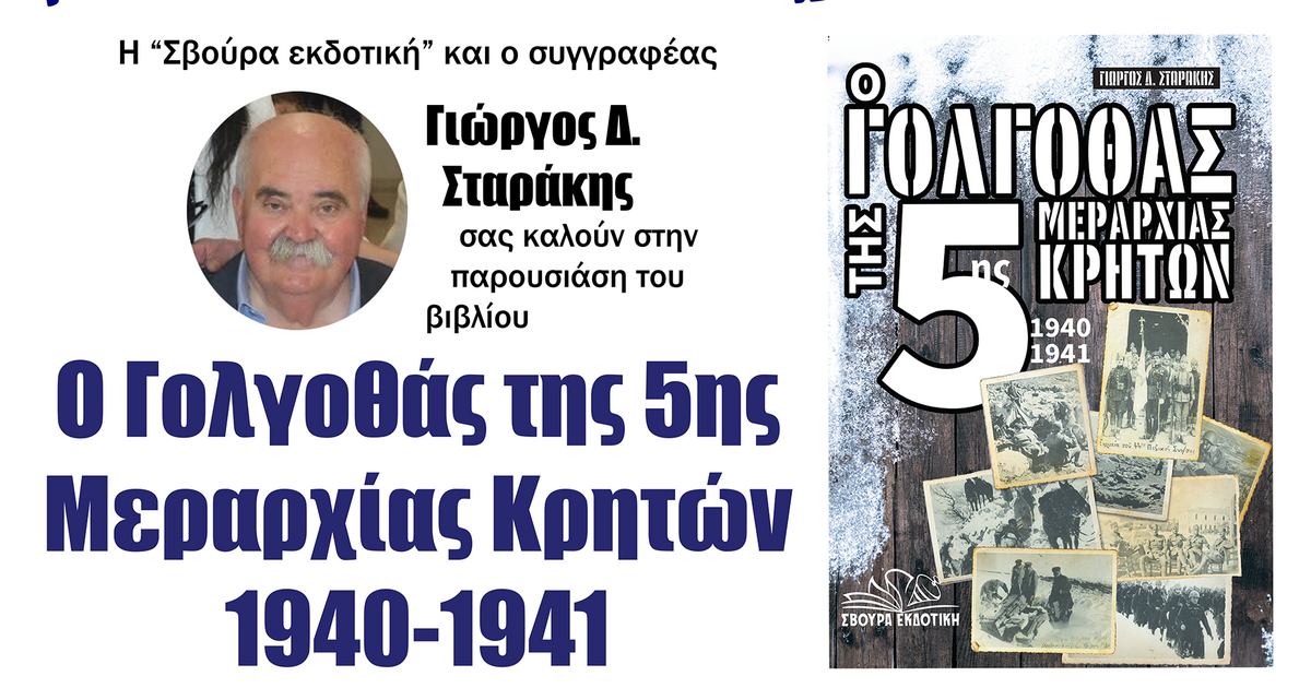 Μια ξεχωριστή βραδιά ιστορικής μνήμης με αφορμή την επέτειο της 28ης Οκτωβρίου 1940, στο Πολύκεντρο Ηρακλείου όπου θα γίνει η παρουσίαση του βιβλίου «Ο Γολγοθάς της 5ης Μεραρχίας Κρητών 1940-1941» του Γιώργου Σταράκη, που κυκλοφορεί από τις εκδόσεις «Σβούρα Εκδοτική». Μιας έκδοσης που αναδεικνύει με συγκλονιστικό τρόπο μια από τις πιο ηρωικές και δραματικές σελίδες της νεότερης ελληνικής ιστορίας.