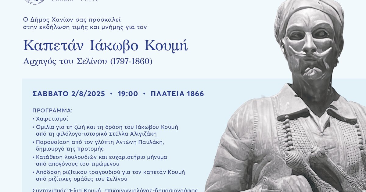 Ο Δήμος Χανίων διοργανώνει εκδήλωση τιμής και μνήμης για τον καπετάν Ιάκωβο Κουμή (1797–1860), αρχηγό του Σελίνου, το Σάββατο 2 Αυγούστου 2025 και ώρα 19:00, στην Πλατεία 1866, μπροστά από την προτομή του μεγάλου αγωνιστή.