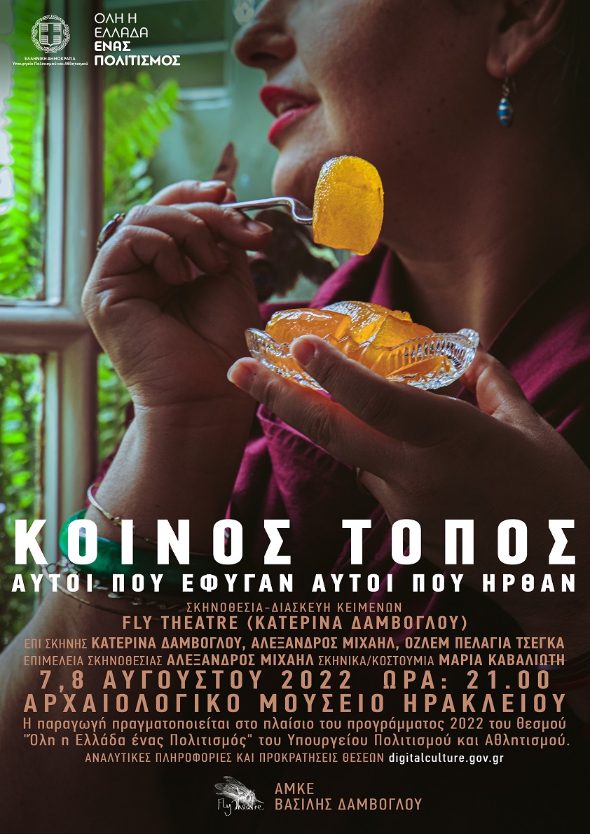 Γύρω από τον ιερό κοινό τόπο ενός τραπεζιού, άνθρωποι μοιράζονται γεύσεις, αρώματα και μνήμες. Συναντιούνται μέσα από τη γλώσσα, τη μουσική, την παράδοση και τους κόσμους που αυτά συνθέτουν, στο συμβολικό αυτό τόπο του τραπεζιού για να μοιραστούν τις ιστορίες των προγόνων τους. Μικρασιάτες και Τουρκοκρητικοί, γεμάτοι από τον τόπο που τους έθρεψε, νοσταλγούν το παρελθόν και το μετουσιώνουν σ’ένα γόνιμο μέλλον. Η περίοδος της ανταλλαγής των πληθυσμών ξετυλίγεται από τους Fly Theatre πάνω σ’ένα τραπέζι που στήνεται στον κατάφυτο κήπο του Αρχαιολογικού Μουσείου Ηρακλείου στις 7 και 8 Αυγούστου 2022. Οι Fly Theatre δραματοποιούν μνήμες αλλά και τις αφηγήσεις που κατέγραψε η Ρεθυμνιώτισσα συγγραφέας Μαρία Τσιριμονάκη στο βιβλίο της «αυτοί που έφυγαν, αυτοί που ήρθαν» σε ύφος documentation theatre.