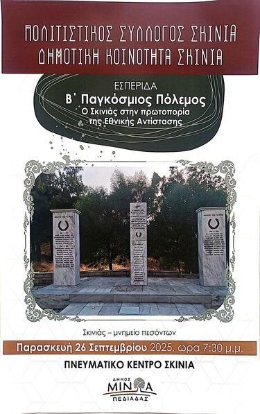 Ο Πολιτιστικός Σύλλογος και η Δημοτική Κοινότητα Σκινιά, με την υποστήριξη του Δήμου Μινώα Πεδιάδας, διοργανώνουν εσπερίδα τιμής και μνήμης, με τον τίτλο: «Β’ Παγκόσμιος Πόλεμος – Ο Σκινιάς στην πρωτοπορία της Εθνικής Αντίστασης», αφιερωμένη στην ιστορία του χωριού κατά τη διάρκεια του Β’ Παγκοσμίου Πολέμου.