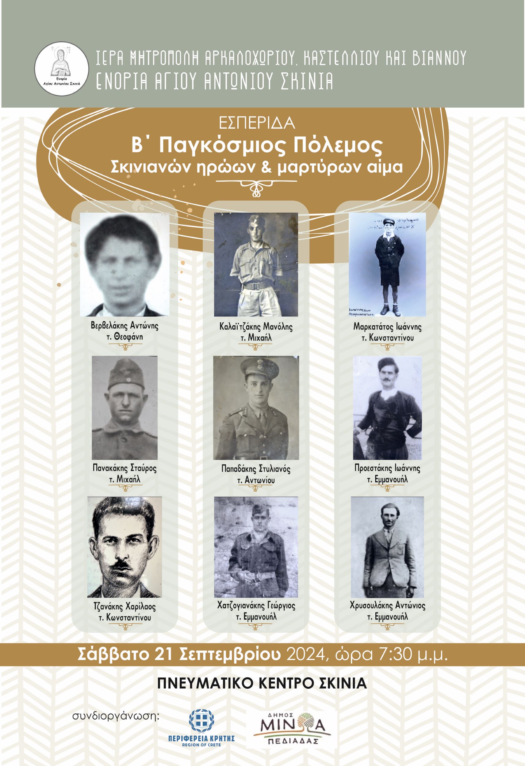 Το Σάββατο 21 Σεπτεμβρίου 2024 και ώρα 7.30 μ.μ. στο Πνευματικό Κέντρο Σκινιά θα πραγματοποιηθεί με τη στήριξη της Περιφέρειας Κρήτης, η εκδήλωση με τίτλο «Β’ Παγκόσμιος Πόλεμος – Σκινιανών ηρώων και μαρτύρων αίμα». Αυτή η εκδήλωση σηματοδοτεί την αρχή της προσπάθειας να αναδειχθεί η πλούσια ιστορία του χωριού Σκινιά και να σκιαγραφηθούν άγνωστες πτυχές της ιστορίας του, σχετικές με τα θύματα που θυσιάστηκαν κατά την δύσκολη αυτή περίοδο της πατρίδας μας.