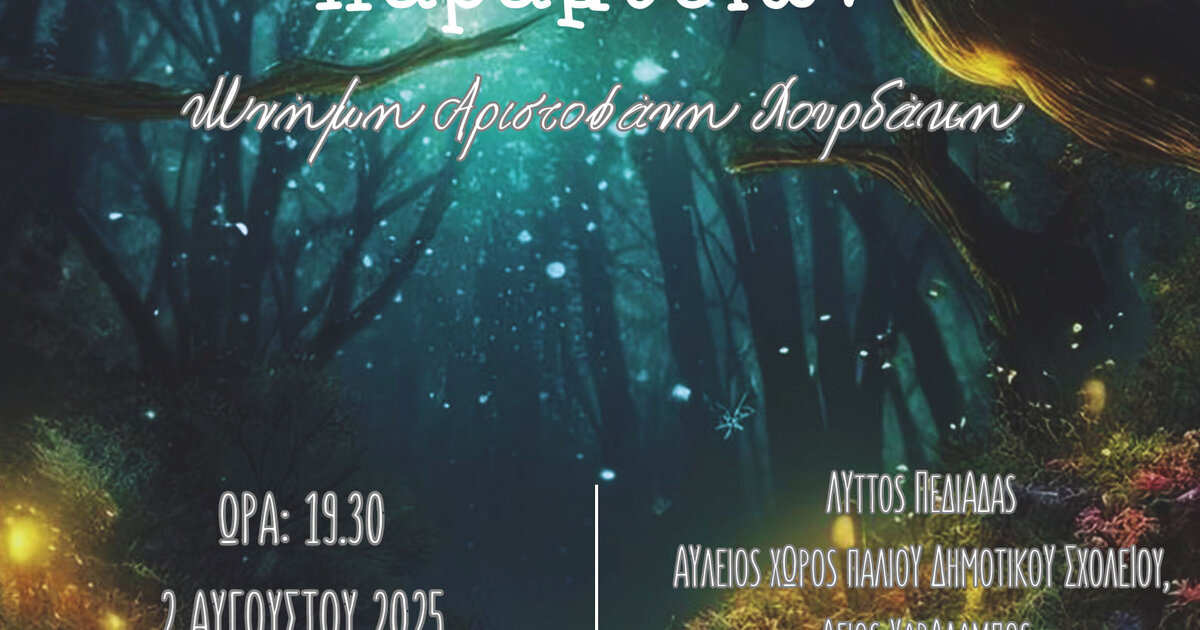 Μια ξεχωριστή βραδιά, αφιερωμένη στην τέχνη της προφορικής αφήγησης και στη μνήμη του Αριστοφάνη Xουρδάκη, διοργανώνεται το Σάββατο 2 Αυγούστου 2025 στη Λύττο Πεδιάδας.