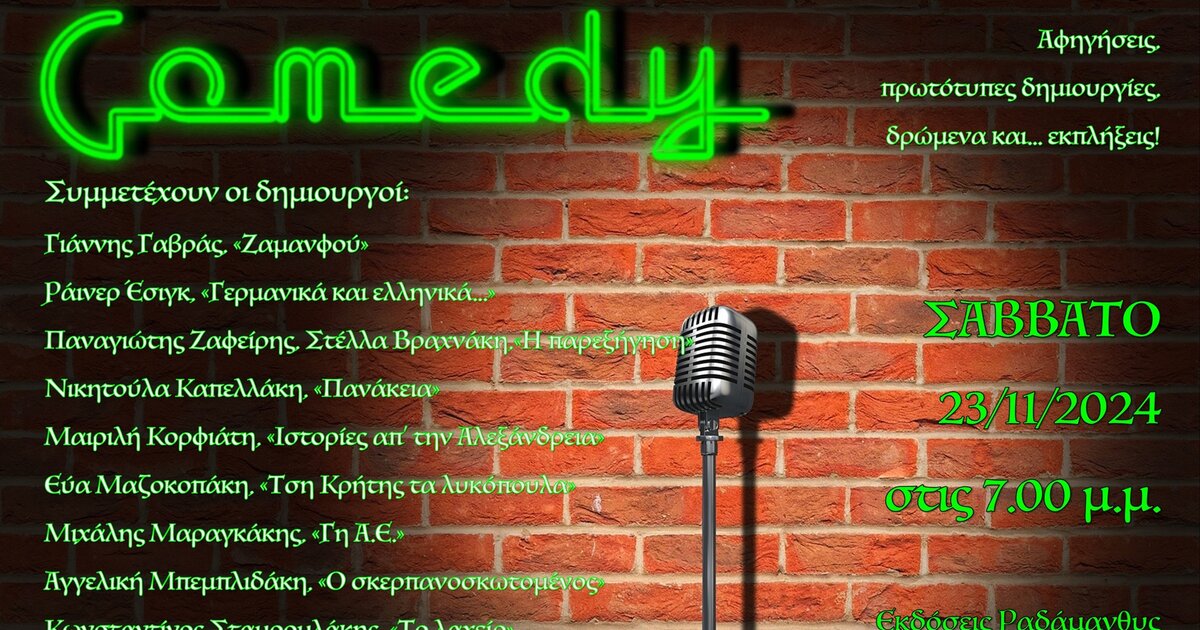 Σε μια βραδιά αφιερωμένη στην κωμωδία, στη σάτιρα και στον αυτοσχεδιασμό, που περιλαμβάνει, αφηγήσεις, θεατρικά δρώμενα και εκπλήξεις, σας προσκαλούν οι Εκδόσεις Ραδάμανθυς και το Εργαστήρι Δημιουργικής Γραφής και Αυτογνωσίας, το Σάββατο 23 Νοεμβρίου 2024, στις 7 το απόγευμα, στον χώρο των εκδόσεων, στην οδό Γ. Ξέπαπα 7, στα Χανιά.