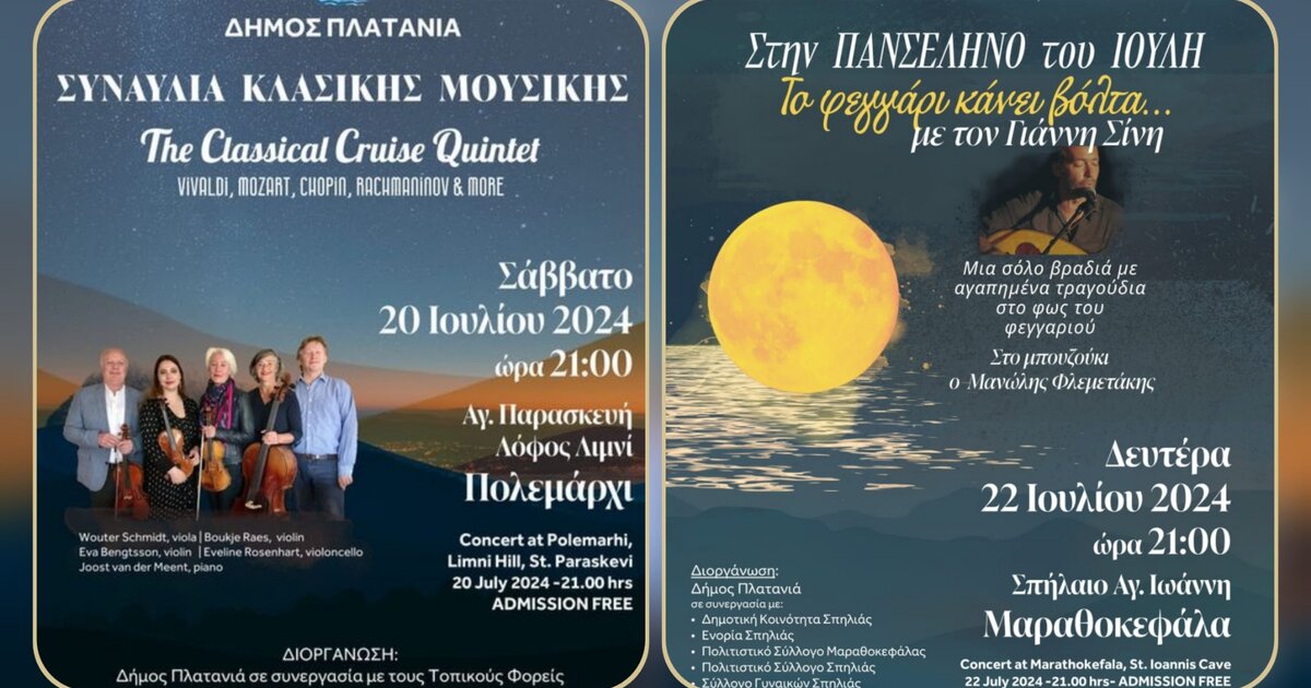 Επίσης, τη Δευτέρα 22 Ιουλίου και ώρα 21:00, κάτω από την πανσέληνο του Ιούλη, σε ένα από τα πιο χαρακτηριστικά τοπόσημα του Δήμου Πλατανιά, στο Σπήλαιο του Αγίου Ιωάννη, στη Μαραθοκεφάλα της Δημοτικής Κοινότητας Σπηλιάς, ο μουσικός Γιάννης Σίνης θα ερμηνεύσει αγαπημένα τραγούδια, στο φως του φεγγαριού. Μπουζούκι : Μανώλης Φλεμετάκης.