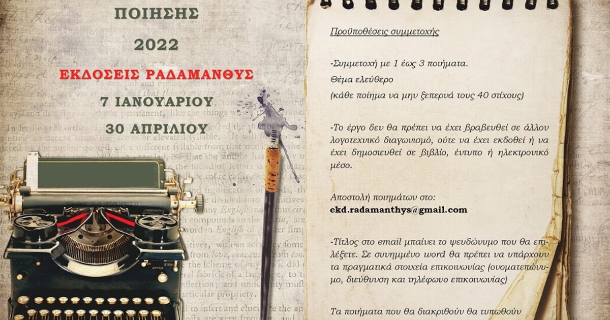 Οι Εκδόσεις Ραδάμανθυς προκηρύσσουν Διαγωνισμό Ποίησης για το 2022. Οι δημιουργοί που θέλουν να συμμετάσχουν πρέπει να στείλουν τα έργα τους έως και τις 30 Απριλίου. Τα ποιήματα που θα διακριθούν θα τυπωθούν