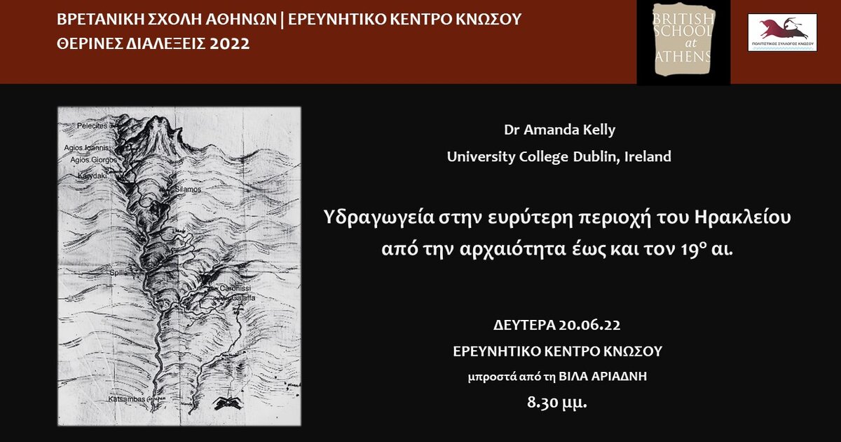 Στο πλαίσιο της σειράς ομιλιών ΘΕΡΙΝΕΣ ΔΙΑΛΕΞΕΙΣ 2022, σας προσκαλούμε στην ομιλία "Υδραγωγεία στην ευρύτερη περιοχή του Ηρακλείου από την αρχαιότητα έως και τον 19ο αι» με την Dr Amanda Kelly, University College, Δουβλίνο, για τα τελευταία ευρήματα πάνω στο πολύ ενδιαφέρον ζήτημα της ύδρευσης του Ηρακλείου.