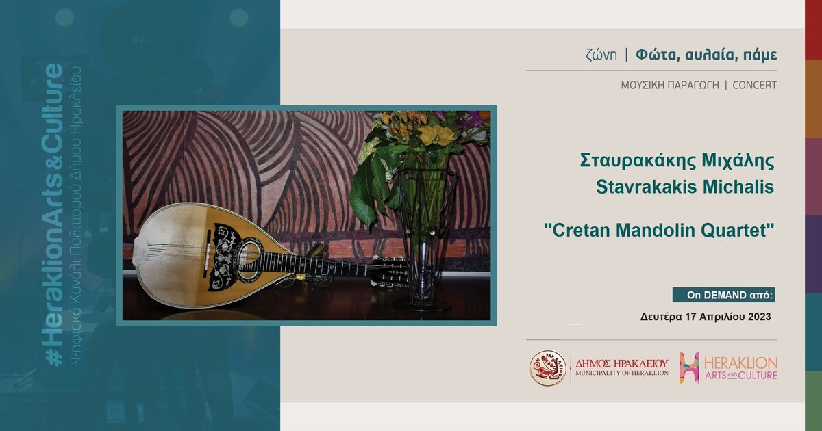 Η συναυλία «Cretan Mandolin Quartet» με τον Μιχάλη Σταυρακάκη που παρουσιάστηκε στο κηποθέατρο «Μάνος Χατζιδάκις» στο πλαίσιο του Φεστιβάλ «Κρήτη μια Ιστορία, 5+1 πολιτισμοί» είναι πλέον διαθέσιμη στο κανάλι πολιτισμού Heraklion Arts and Culture