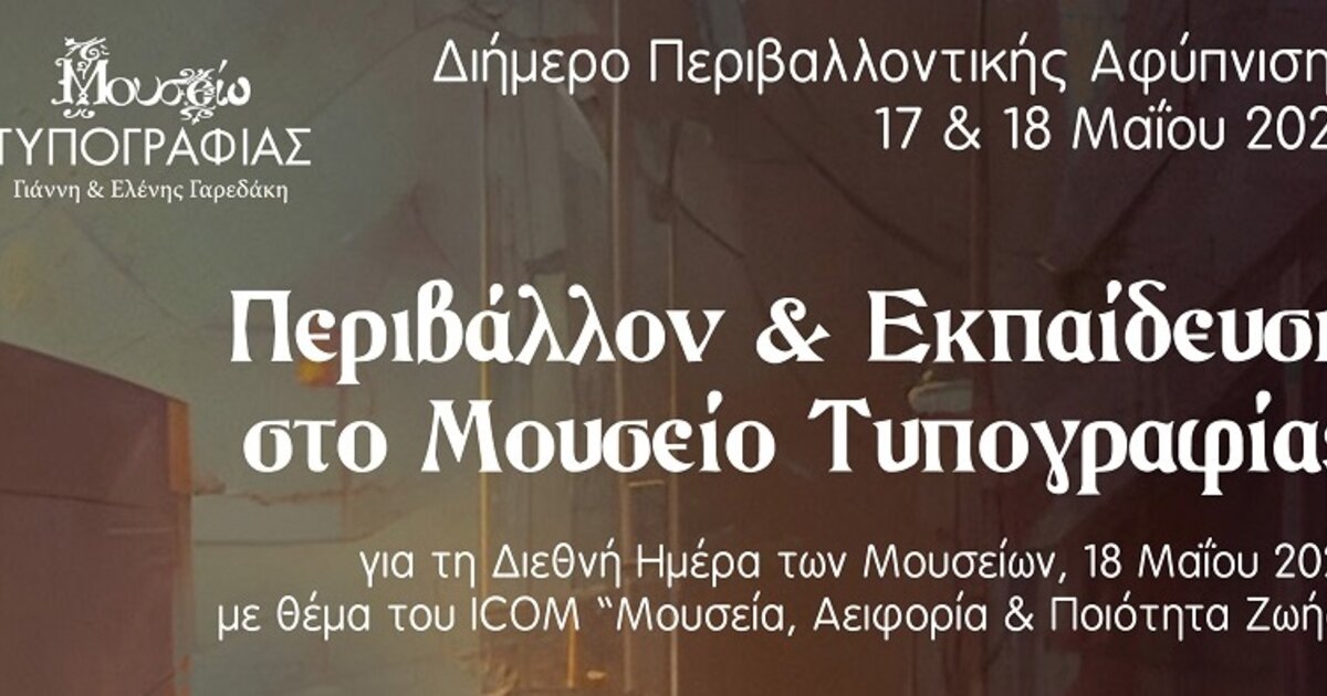 Το Μουσείο Τυπογραφίας Γιάννη & Ελένης Γαρεδάκη, διοργανώνει Διήμερο Περιβαλλοντικής Αφύπνισης, 17 & 18 Μαϊου 2023 με τίτλο “Περιβάλλον & Εκπαίδευση στο Μουσείο Τυπογραφίας”, για τη Διεθνή Ημέρα των Μουσείων, 18 Μαΐου 2023, με θέμα του ICOM “Μουσεία, Αειφορία & Ποιότητα Ζωής”. Θα γίνει ζωντανή αναμετάδοση στο: https://youtube.com/live/wlSolirleH4?feature=share