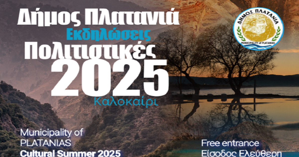 Ο Δήμος Πλατανιά και η Κοινωφελής Επιχείρηση του Δήμου, σε συνεργασία με την Περιφέρεια Κρήτης, διοργανώνουν το “Πολιτιστικό Καλοκαίρι 2025 – 15ο Φεστιβάλ ΓΗ – ΠΟΛΙΤΙΣΜΟΣ – ΤΟΥΡΙΣΜΟΣ”, ενός πολυθεματικού κύκλου πολιτιστικών εκδηλώσεων που θα πραγματοποιηθούν καθ’ όλη τη διάρκεια του καλοκαιριού, σε κοινότητες του Δήμου Πλατανιά.