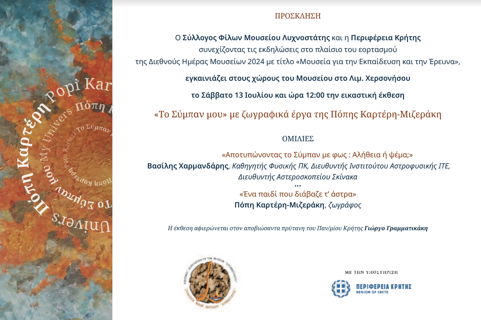 Το Μουσείο παραδοσιακής ζωής Κρήτης «ΛΥΧΝΟΣΤΑΤΗΣ» συνεχίζοντας τις εκδηλώσεις για τον εορτασμό της Διεθνούς Ημέρας Μουσείων 2024 με τίτλο «Μουσεία για την Εκπαίδευση και την Έρευνα», εγκαινιάζει το Σάββατο 13 Ιουλίου την εικαστική έκθεση «Tο Σύμπαν μου» με ζωγραφικά έργα της Πόπης Καρτέρη-Μιζεράκη.