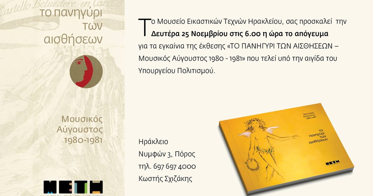 Το Μουσείο Εικαστικών τεχνών Ηρακλείου διοργανώνει την ερχόμενη Δευτέρα 25 Νοεμβρίου, στις 6:00 το απόγευμα εκδήλωση με αφορμή τα εγκαίνια της έκθεσης “Το πανηγύρι των αισθήσεων – Μουσικός Αύγουστος 1980 – 1981”.