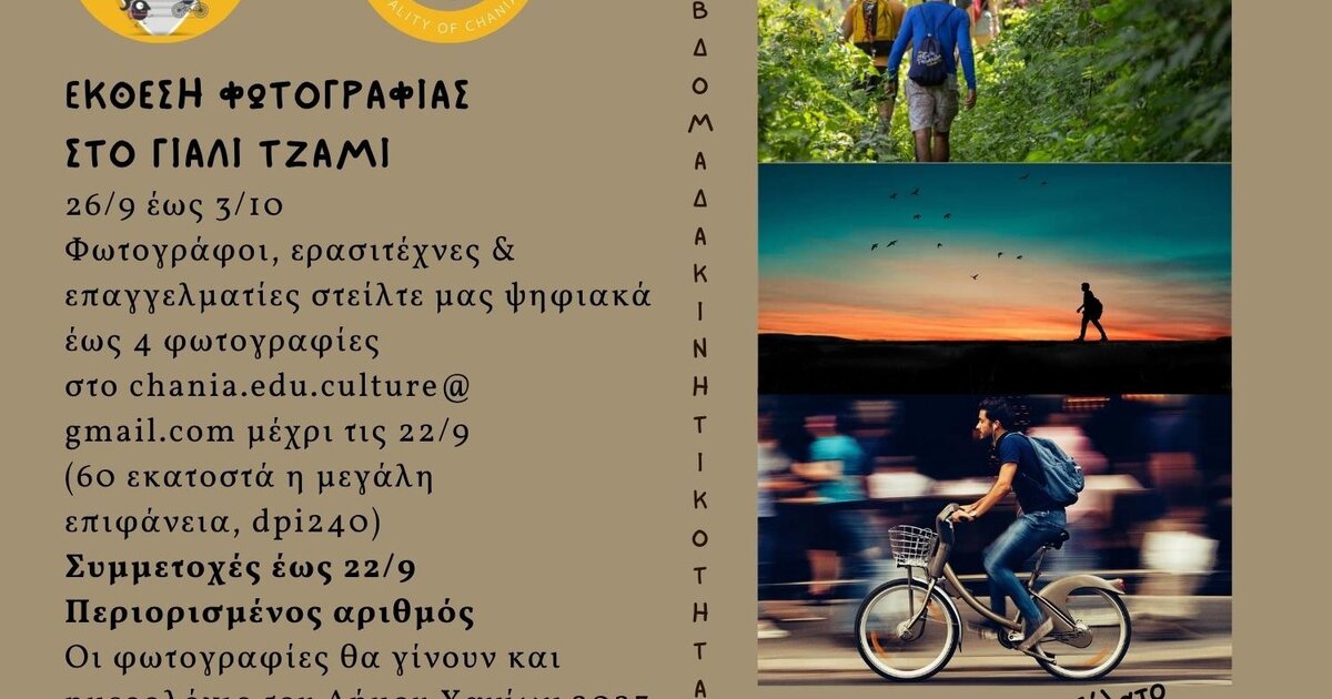 Τα εγκαίνια της έκθεσης φωτογραφίας, με τίτλο: «Μετακίνηση χωρίς αυτοκίνητο», που διοργανώνουν ο Δήμος Χανίων, το Δημοτικό Λιμενικό Ταμείο και η ΚΕΠΠΕΔΗΧ - ΚΑΜ, στο Γιαλί Τζαμί, θα πραγματοποιηθούν σήμερα, Τετάρτη 28/9/2022, στις 20.00.