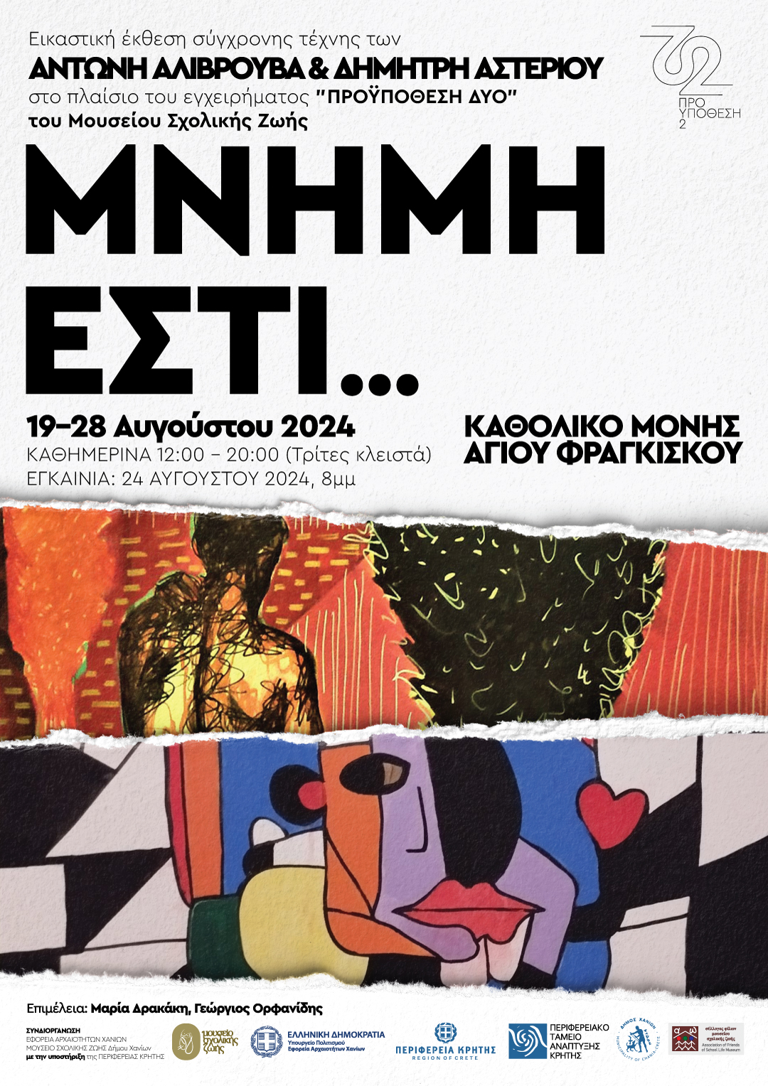 «ΜΝΗΜΗ ΕΣΤΙ…»: Εικαστική έκθεση σύγχρονης τέχνης των Αντώνη Αλιβρούβα & Δημήτρη Αστερίου στο Καθολικό της Μονής του Αγίου Φραγκίσκου, στα Χανιά, 19-28 Αυγούστου 2024. Εγκαίνια: 24 Αυγούστου, στις 20.00. Ωράριο λειτουργίας: Καθημερινά, 12.00-20.00 (Τρίτες κλειστά). Με την υποστήριξη της Περιφέρειας Κρήτης, και ειδικό-έντυπο χαιρετισμό του Περιφερειάρχη Κρήτης, κ. Σταύρου Αρναουτάκη, στο βιβλίο τέχνης-εικαστικό κατάλογο της έκθεσης.