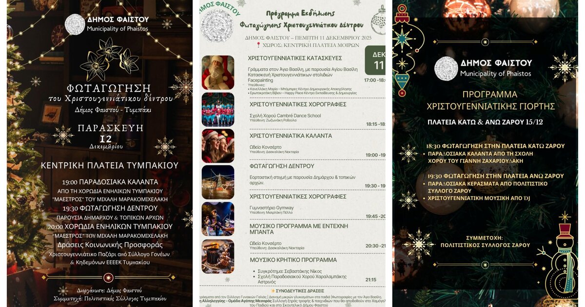 Ο Δήμος Φαιστού προσκαλεί τους δημότες και τους επισκέπτες να συμμετάσχουν στις φετινές εορταστικές εκδηλώσεις φωταγώγησης των Χριστουγεννιάτικων Δέντρων στις Δημοτικές Ενότητες Μοιρών, Τυμπακίου και Ζαρού.