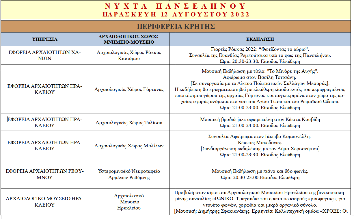 Την Παρασκευή 12 Αυγούστου 2022, 105 αρχαιολογικοί χώροι, ιστορικοί τόποι, μουσεία και μνημεία, σε ολόκληρη τη χώρα, θα υποδεχθούν το κοινό κάτω από το φως της πανσελήνου. Εκδηλώσεις θα πραγματοποιηθούν σε 50 αρχαιολογικούς χώρους και μουσεία, ενώ 55 θα παραμείνουν ανοιχτοί για το κοινό με ελεύθερη είσοδο. Η φετινή διοργάνωση, θα πλαισιωθεί από εκδηλώσεις στις 11 Αυγούστου, καθώς επίσης και στις 13, 19, 20 και 27 Αυγούστου. Το πρόγραμμα, περιλαμβάνει κυρίως συναυλίες, αλλά και θεατρικές και χοροθεατρικές παραστάσεις, ποιητικές βραδιές, προβολές, αστροπαρατήρηση και ξεναγήσεις, πολλές εκ των οποίων πραγματοποιούνται σε συνεργασία με την τοπική αυτοδιοίκηση και τοπικούς συλλόγους. Το πρόγραμμα πραγματοποιείται υπό τον συντονισμό της Γενικής Διεύθυνσης Αρχαιοτήτων και Πολιτιστικής Κληρονομιάς.