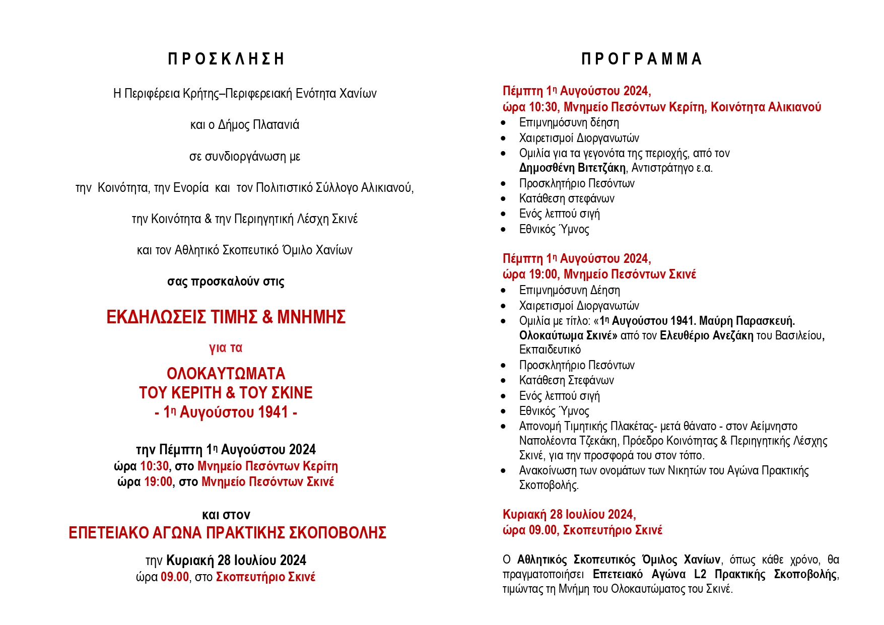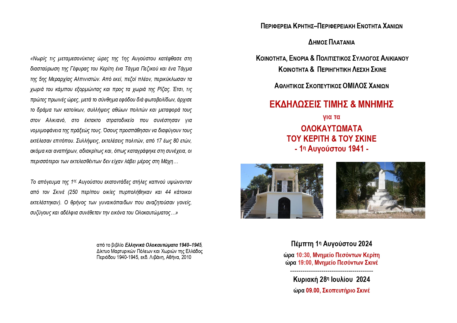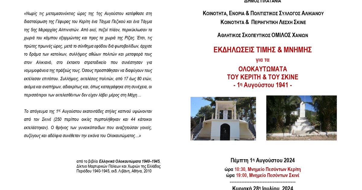 Εκδηλώσεις τιµής και µνήµης για τα Ολοκαυτώµατα του Κερίτη και του Σκινέ, που έγιναν την 1η Αυγούστου το 1941, διοργανώνουν οι Περιφέρεια Κρήτης – Π.E. Χανίων και ο Δήµος Πλατανιά, σε συνδιοργάνωση µε την Κοινότητα, την Ενορία και τον Πολιτιστικό Σύλλογο Αλικιανού, την Κοινότητα & την Περιηγητική Λέσχη Σκινέ και τον Αθλητικό Σκοπευτικό