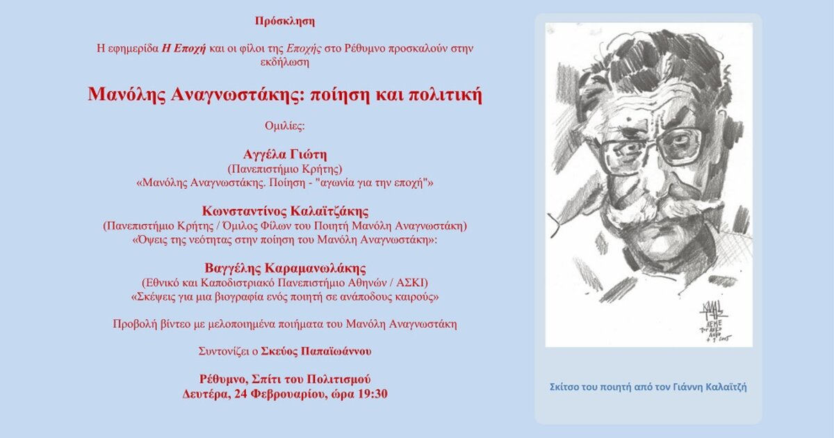 Με αφορμή τη συμπλήρωση 100 χρόνων από τη γέννηση και 20 χρόνων από τον θάνατο του Μανόλη Αναγνωστάκη, η εφημερίδα «Η Εποχή» και οι φίλοι της Εποχής στο Ρέθυμνο διοργανώνουν εκδήλωση στη μνήμη του ποιητή με θέμα «Μανόλης Αναγνωστάκης: ποίηση και πολιτική».