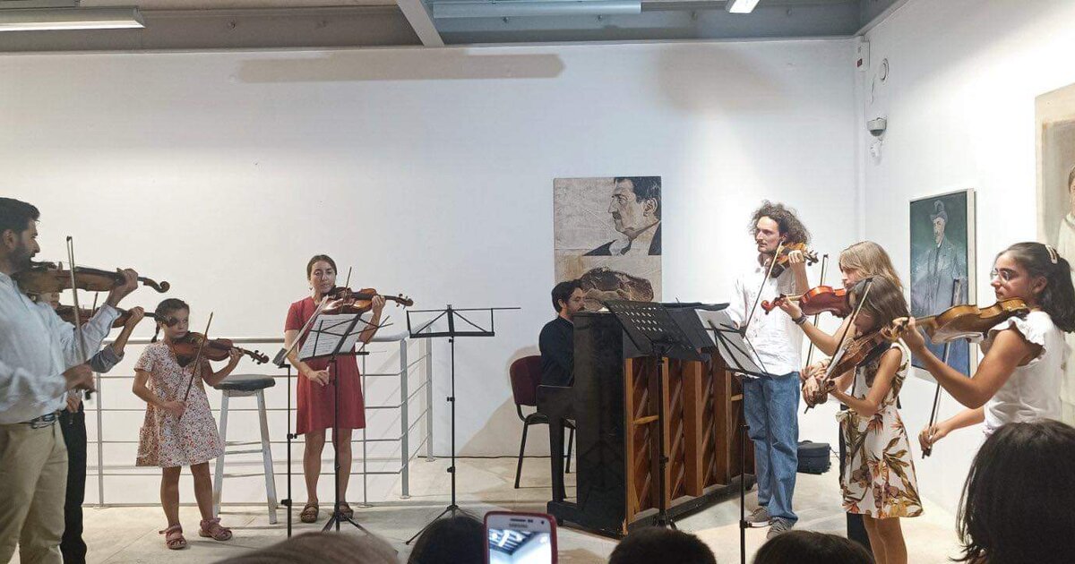 Σύνολο σπουδαστών βιολιού και μέλη Συμφωνικής Ορχήστρας Νέων Κρήτης Δήμου Ηρακλείου υπό την καθοδήγηση του εκπαιδευτή του τμήματος εγχόρδων της Γιάννη Πετράκη: