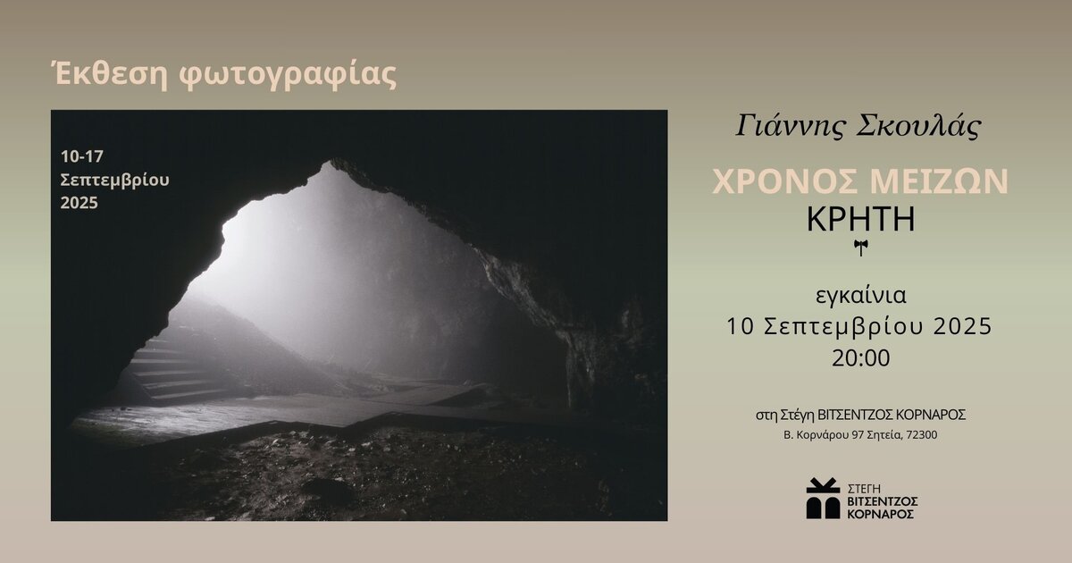 Εγκαινιάζεται την Τετάρτη, 10 Σεπτεμβρίου στις 20:00, στη στέγη Βιτσέντζος Κορνάρος στη Σητεία, η έκθεση φωτογραφίας του Γιάννη Σκουλά με τίτλο «ΧΡΟΝΟΣ ΜΕΙΖΩΝ-ΚΡΗΤΗ».