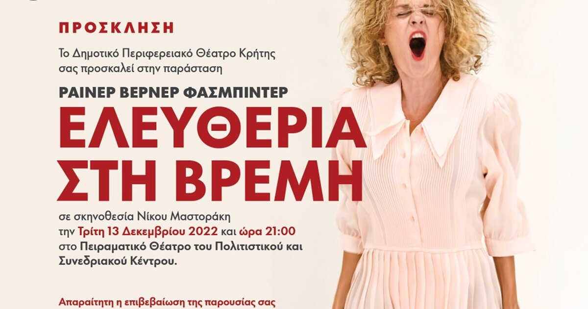 Η παράσταση «Ελευθερία στη Βρέμη» του Ράινερ Βέρνερ Φάσμπιντερ, χειμερινή παραγωγή του ΔΗΠΕΘΕ Κρήτης, για την περίοδο 2022-23, έκανε πρεμιέρα στα Χανιά στις 30 Νοεμβρίου, σε νέα μετάφραση του Γιώργου Δεπάστα, διασκευή, σκηνοθεσία, σκηνικά, κοστούμια, μουσική επιμέλεια Νίκου Μαστοράκη και με μια εξαιρετική ομάδα ηθοποιών και συντελεστών. Η παράσταση θα περιοδεύσει στη συνέχεια σε όλη την Κρήτη.