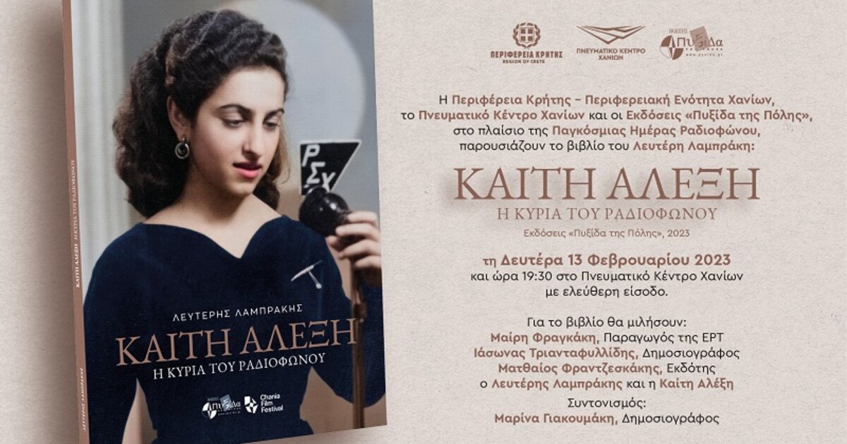 Η Περιφέρεια Κρήτης – Περιφερειακή Ενότητα Χανίων, το Πνευματικό Κέντρο Χανίων και οι εκδόσεις Πυξίδα της Πόλης, στο πλαίσιο της Παγκόσμιας Ημέρας Ραδιοφώνου, παρουσιάζουν το βιβλίο του Λευτέρη Λαμπράκη «Καίτη Αλέξη. Η Κυρία του Ραδιοφώνου» εκδόσεις Πυξίδα της Πόλης, 2023, την Δευτέρα 13 Φεβρουαρίου 2023, ώρα 7.30 μ.μ., στο Πνευματικό Κέντρο Χανίων.