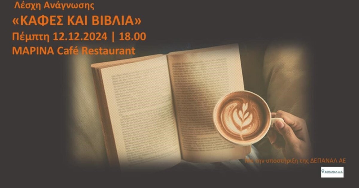 Η πρώτη συνάντηση της Λέσχης Ανάγνωσης «Καφές και Βιβλία» θα πραγματοποιηθεί την Πέμπτη 12 Δεκεμβρίου και ώρα 18:00, στο Café – Restaurant «Marina» με την υποστήριξη της ΔΕΠΑΝΑΛ Α.Ε.