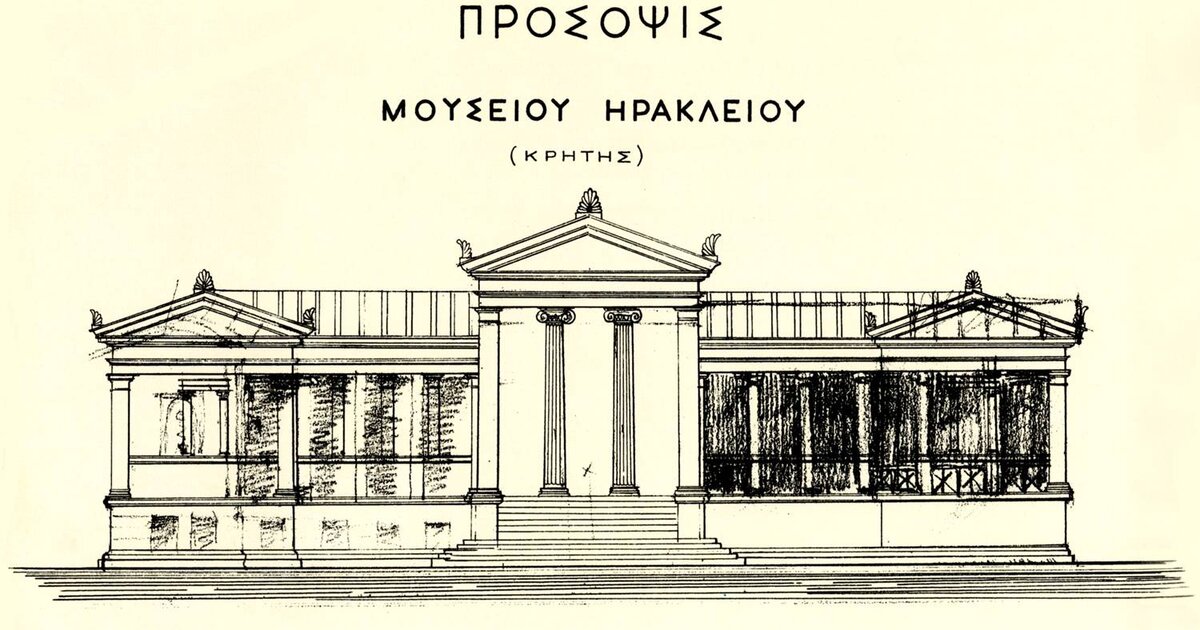Η σχεδιαστική πρόταση του Γερμανού αρχαιολόγου-αρχιτέκτονα Wilhelm Dörpfeld για το πρώτο κτήριο του Αρχαιολογικού Μουσείου Ηρακλείου στις αρχές του 20ου αιώνα. Το κλασικότροπο σχέδιο δεν υλοποιήθηκε ποτέ στο σύνολό του (©ΥΠΠΟ/Αρχαιολογικό Μουσείο Ηρακλείου).