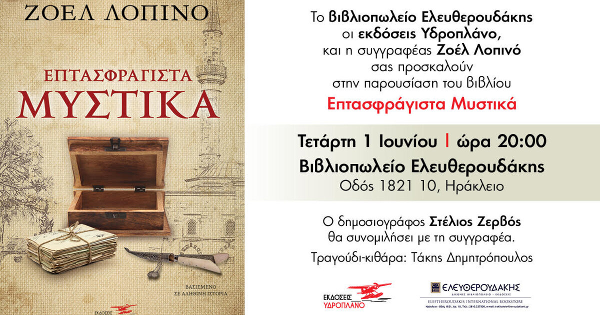 Το νέο της βιβλίο με τίτλο: "Επτασφράγιστα Μυστικά" παρουσιάζει η Ζοέλ Λοπινό, την Τετάρτη 1 Ιουνίου, στις 20:00, στο χώρο του βιβλιοπωλείου Ελευθερουδάκης, οδός 1821 αριθμός 10. Ο δημοσιογράφος Στέλιος Ζερβός θα συνομιλήσει με τη συγγραφέα. Ο Τάκης Δημητρόπουλος θα τη συνοδεύσει με το τραγούδι και την κιθάρα του.