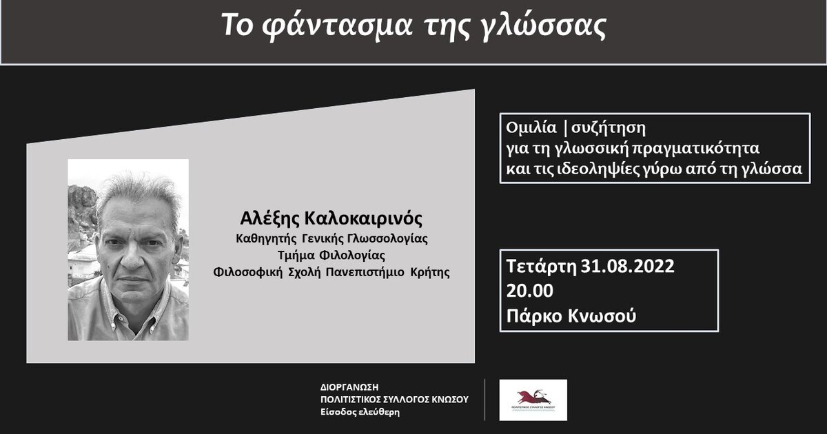 Ο Πολιτιστικός Σύλλογος Κνωσού σας προσκαλεί στην ομιλία /συζήτηση με τίτλο Το φάντασμα της γλώσσας, με ομιλητή τον Αλέξη Καλοκαιρινό, καθηγητή Γενικής Γλωσσολογίας στο Πανεπιστήμιο Κρήτης, την Τετάρτη, 31.08.2022, 20.00, στο Πάρκο Κνωσού.