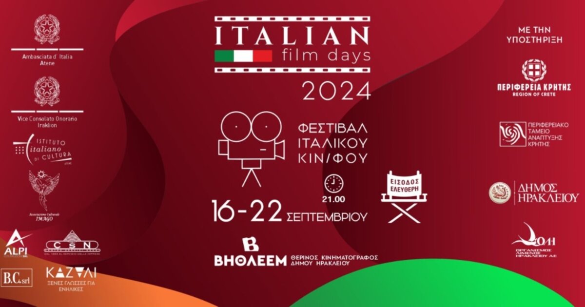 Η Πρεσβεία της Ιταλίας στην Ελλάδα, το Ιταλικό Μορφωτικό Ινστιτούτο Αθηνών και ο Πολιτιστικός Σύλλογος IMAGO, σε συνεργασία με το Επίτιμο Ιταλικό Προξενείο Ηρακλείου, τον Δήμο Ηρακλείου, την Περιφέρεια Κρήτης, το Περιφερειακό Ταμείο Ανάπτυξης Κρήτης, τον Οργανισμό Λιμένος Ηρακλείου Α.Ε και το Κέντρο Ξένων Γλωσσών Καζάλι διοργανώνουν και φέτος το Φεστιβάλ Ιταλικού Κινηματογράφου “Italian Film Days 2024” από 16 έως και 22 Σεπτεμβρίου 2024 στον Θερινό Κινηματογράφο “Βηθλεέμ” του Δήμου Ηρακλείου.