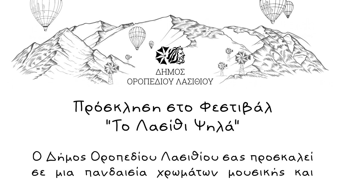 Ο Δήμος Οροπεδίου Λασιθίου οργανώνει το Φεστιβάλ «Το Λασίθι Ψηλά» που θα πραγματοποιηθεί αύριο Παρασκευή 3 Ιουνίου με ώρα έναρξης στις 7 το απόγευμα στο κέντρο του Οροπεδίου Λασιθίου στους χώρους του Αγ. Ιωάννη (Καμπίτη).