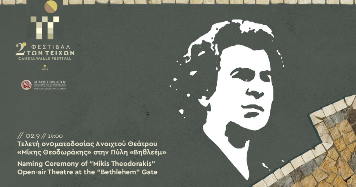 Το απόγευμα της Τρίτης 2/9 στις 19:00 θα πραγματοποιηθεί η τελετή ονοματοδοσίας του Ανοικτού Θεάτρου «Μίκης Θεοδωράκης» στην Πύλη Βηθλεέμ στο πλαίσιο του Φεστιβάλ των Τειχών που διοργανώνει ο Δήμος Ηρακλείου και η Αντιδημαρχία Πολιτισμού με στόχο την ανάδειξη και ενσωμάτωση των Ενετικών τειχών της πόλης στην πολιτιστική ζωή των κατοίκων της και των επισκεπτών της.