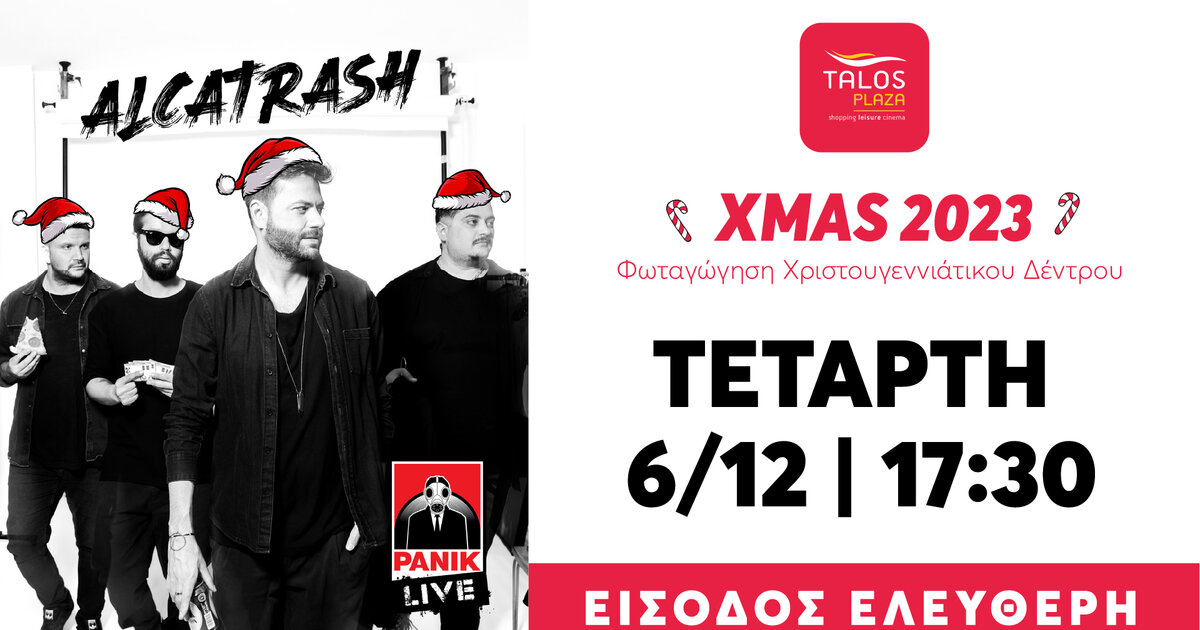 Με ένα πλούσιο πρόγραμμα εκδηλώσεων ξεκινά η εορταστική περίοδος στο Τalos Plaza. Tην Τεταρτη 6/12 υποδεχόμαστε το αγαπημένο party band Alcatrash, με ελεύθερη είσοδο, για όλο τον κόσμο για μια μοναδική συναυλία με πολλή λάμψη και μουσική.