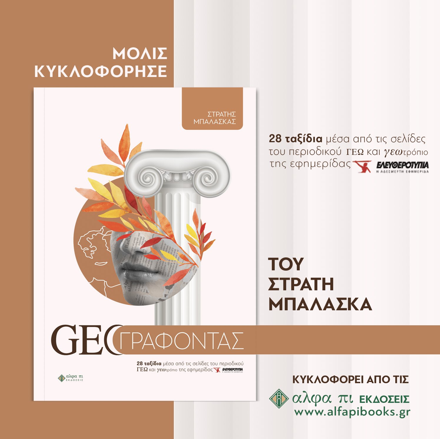 Αυτά τα 28 ταξίδια στην ιστορία και στη μυθολογία, σε γεγονότα και θρύλους αποτυπωμένα με συγγραφική μαεστρία παραδίδονται ακριβώς, όπως τότε είχαν γραφτεί, με τη μορφή του βιβλίου «GEOΓΡΑΦΟΝΤΑΣ» που κυκλοφορεί από τις εκδόσεις «αλφα πι».