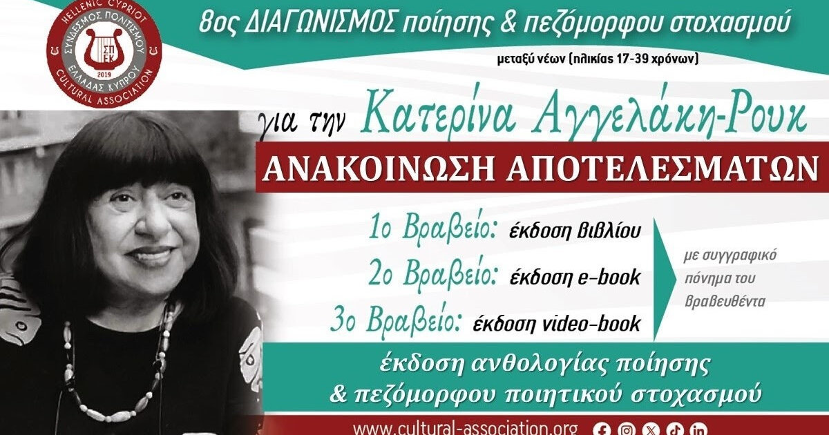 Ο Σύνδεσμος Πολιτισμού Ελλάδας Κύπρου ανακοίνωσε τα αποτελέσματα του 8ου Διαγωνισμού Ποίησης και Πεζόμορφου Ποιητικού Στοχασμού “Για την Κατερίνα Αγγελάκη – Ρουκ”. Ο διαγωνισμός ολοκληρώθηκε με ισχυρή συμμετοχή 200 νέων από Ελλάδα, Κύπρο και Ομογένεια. Η Κριτική Επιτροπή του Διαγωνισμού, βάσει κριτηρίων που διέπουν τις αρχές της λογοτεχνίας, της ποίησης και της γλώσσας, αλλά και σύμφωνα με πρόσθετα κοινωνικά και πολιτισμικά κριτήρια, μελέτησε τις συμμετοχές που κατατέθηκαν και επέλεξε τις 77 που ξεχώρισαν.